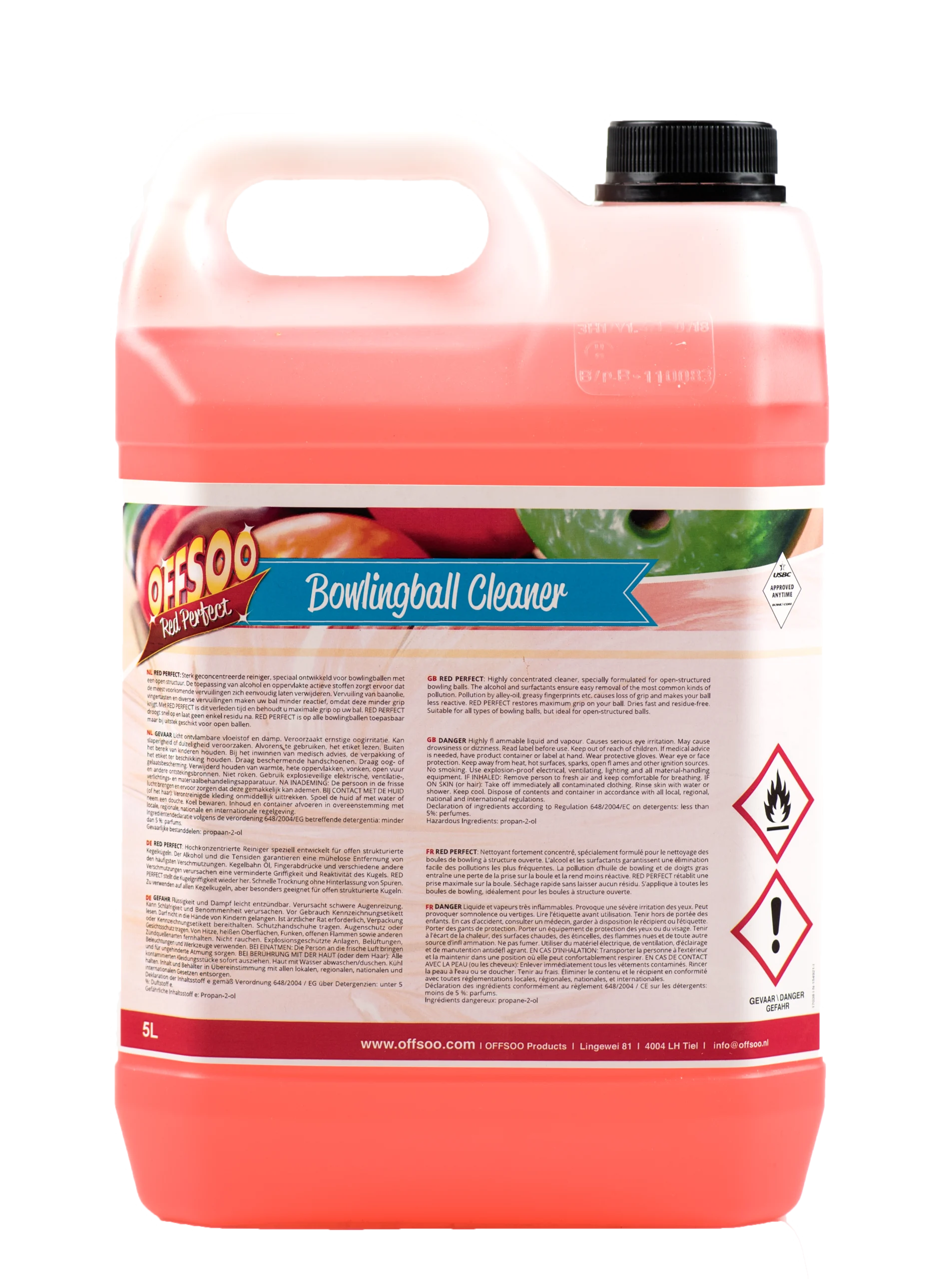 Offsoo Red Perfect bowlingbalcleaner is zeer krachtige reiniger die geschikt is voor bowlingballen met een open structuur (meestal dof van kleur of mat glanzend). Red Perfect bowlingbal cleaner is traag in verdampen, waardoor deze zeer geschikt is vuil en olie op te lossen uit en van uw bowlingbal.